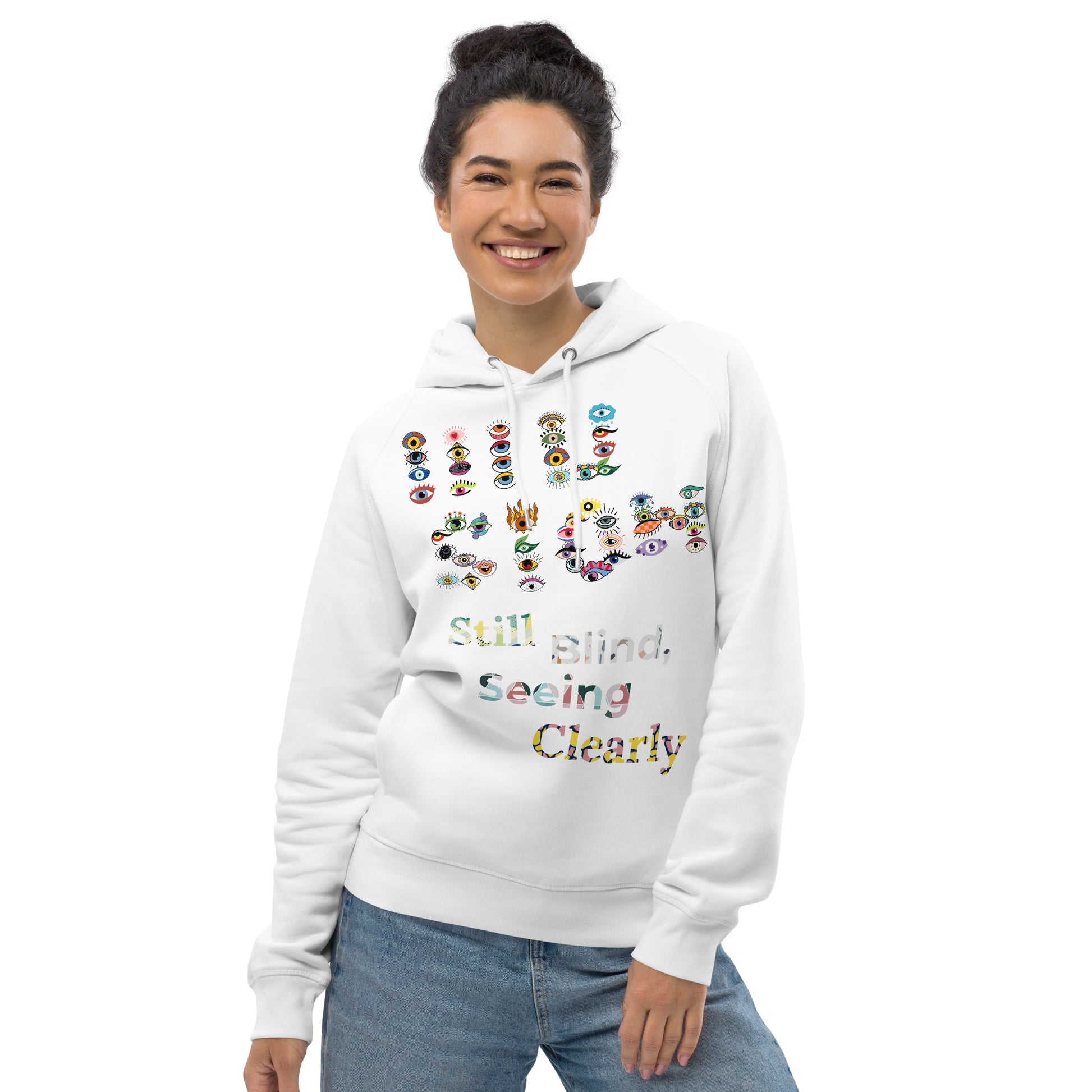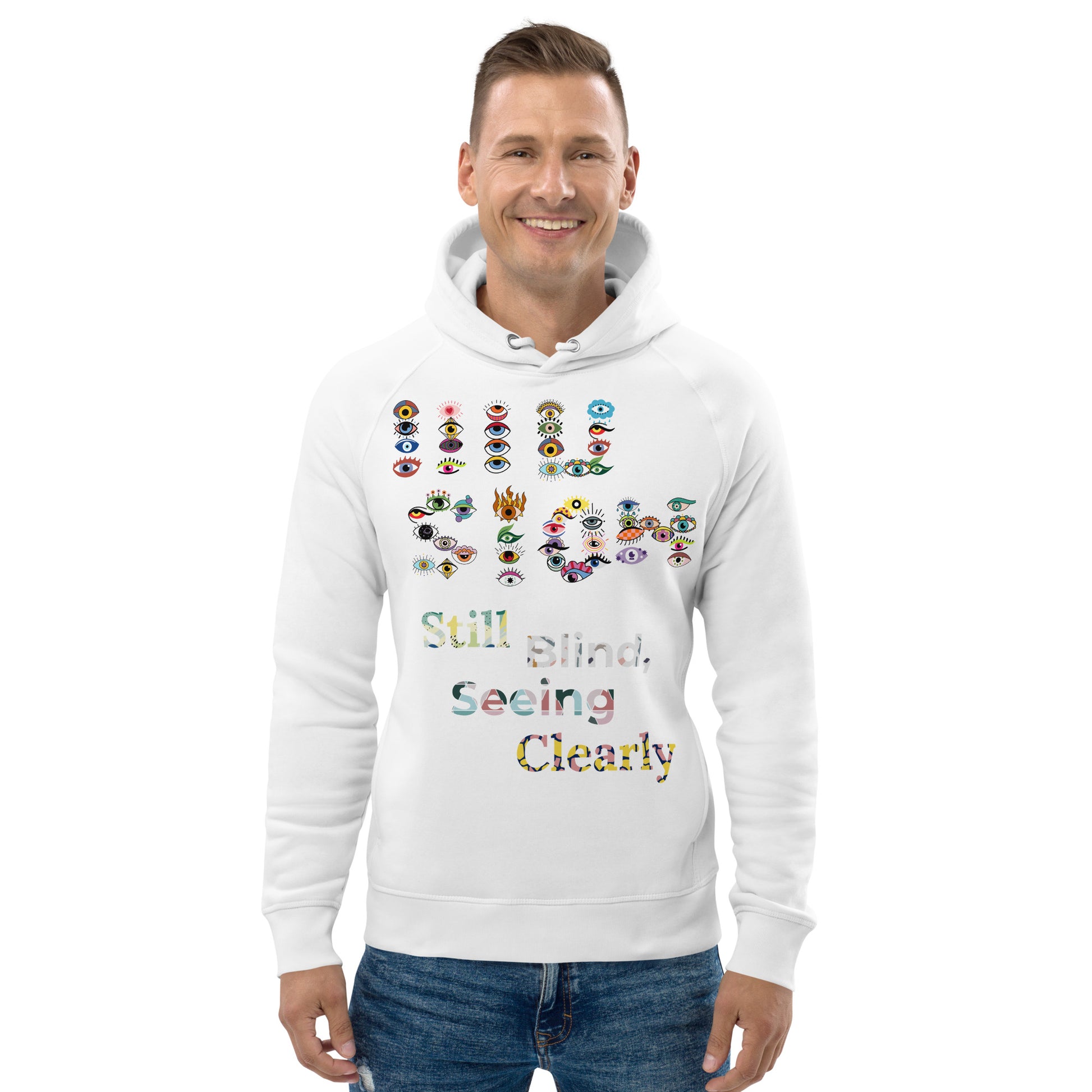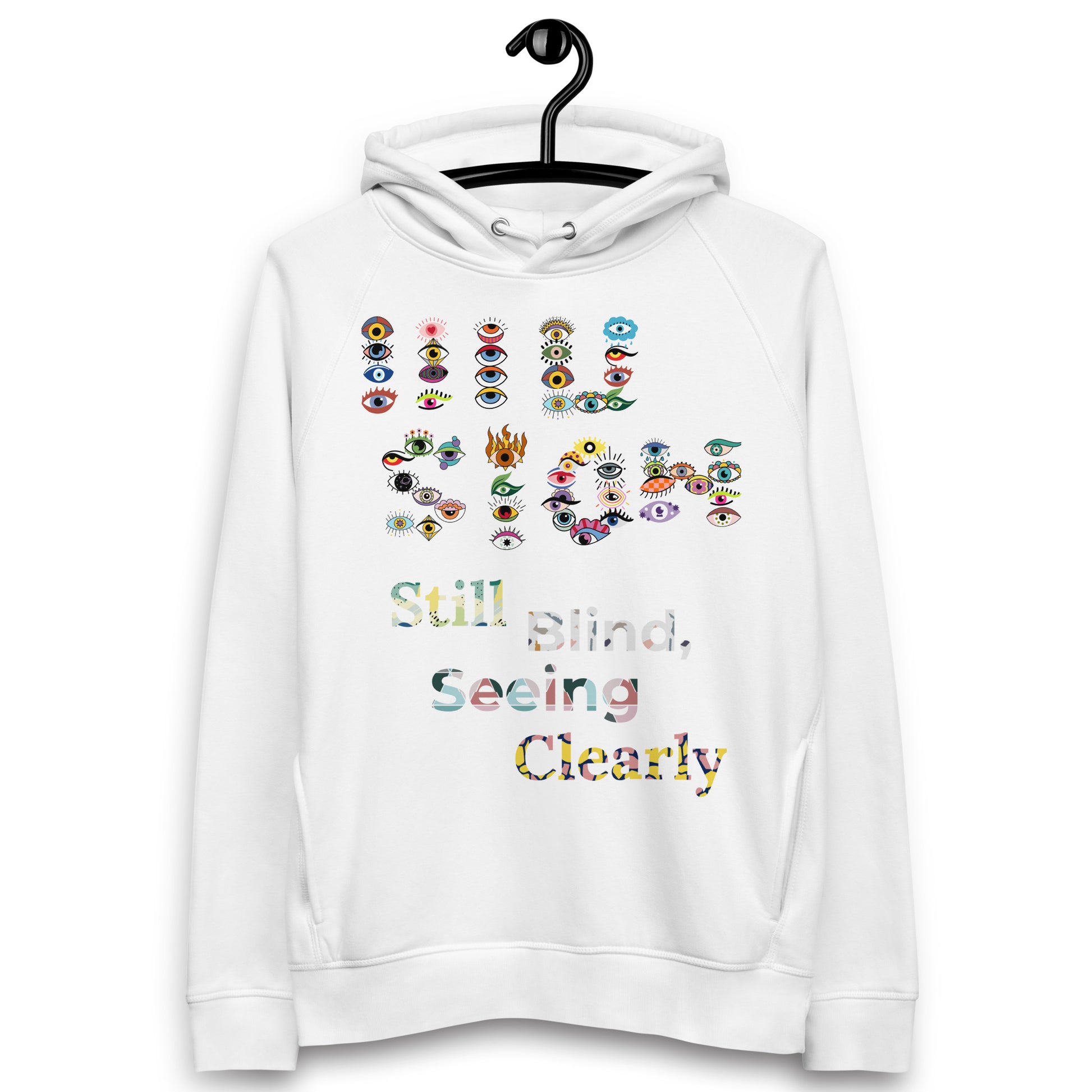 On the front, a mesmerizing arrangement of eyes captures your gaze, each one a portal to the extraordinary. Beneath these captivating eyes, the text "still blind, seeing clearly" playfully reminds us that true vision often transcends the physical realm. It's a witty twist that invites contemplation and tickles the imagination.
