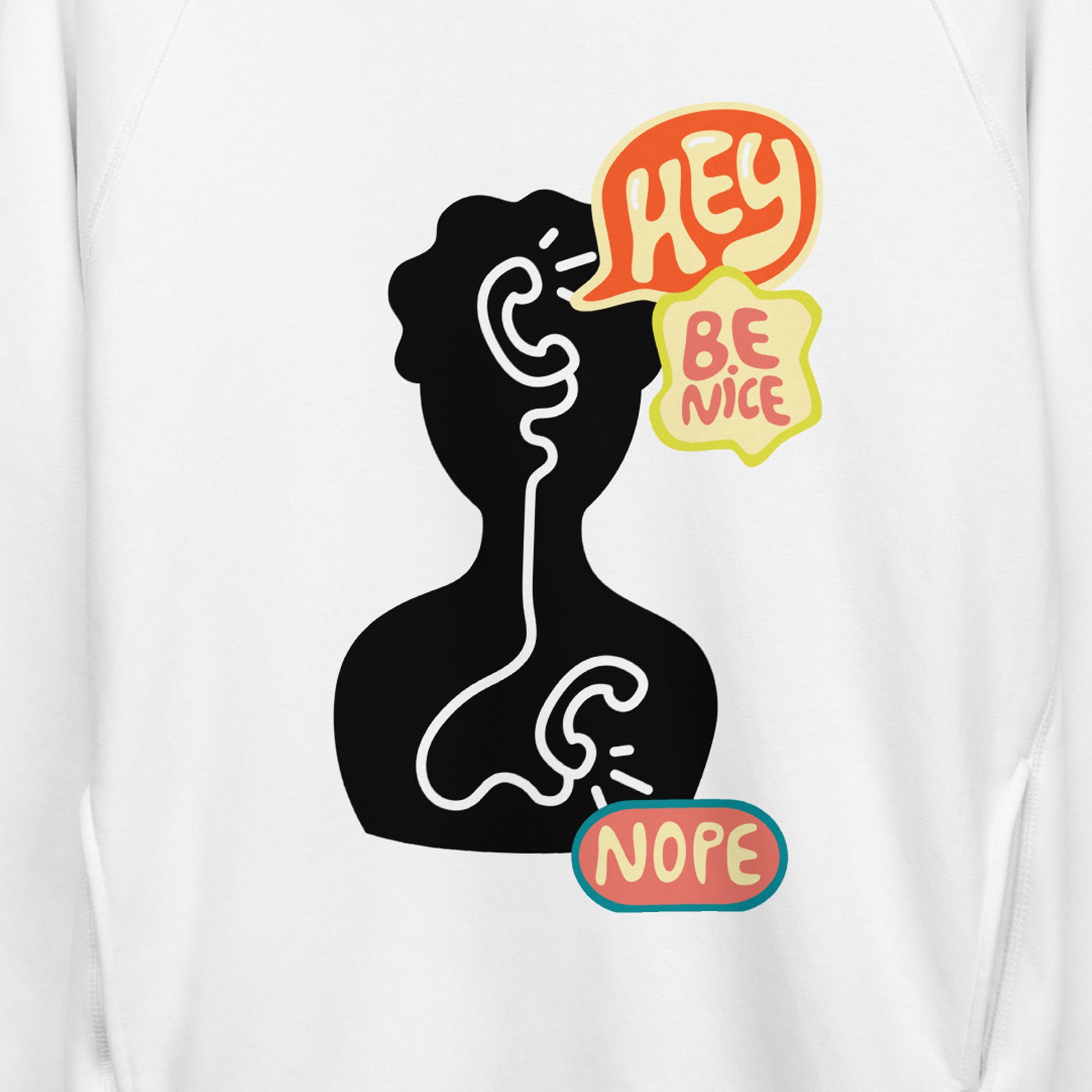 Le cerveau déclare avec audace : « Hé, sois gentil », nous exhortant à adopter la gentillesse et la compassion dans nos interactions. Cependant, le cœur répond avec effronterie par un "Non" résolu, nous rappelant notre nature humaine inhérente pour défier parfois les attentes de la société.